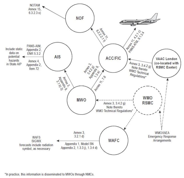 Accidents at nuclear or chemical facilities, in which hazardous materials are discharged into the atmosphere, present a danger to the general public, including those travelling by air, and are already the subject of detailed emergency procedures in States concerned, and regular international tests of the procedures are made. It is not the purpose of organizations such as WMO and ICAO, therefore, to develop separate procedures for aviation, but to ensure that due account is taken of the special needs of international civil aviation, especially aircraft in flight, in the relevant international standards and arrangements developed to deal with such emergencies.