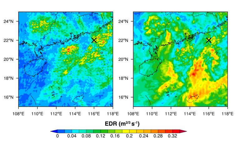 Figure: Estimation of Eddy Dissipation Rate (EDR) based on the variable-resolution NWP model (MPAS) simulation on 21 May 2020. Left: computed EDR based on the conventional second-order structure function method which considers only horizontal variability of the flow. Right: estimated EDR based on the scale-similarity reconstruction of Chow et al. (2005). The black cross marks the location of the reported CIT incident.