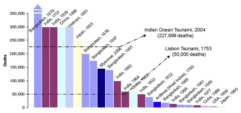 Deaths in tropical cyclones in each year, for highest ranks in history (with indication of relative level of casualties in major tsunami events). Most fatalities in tropical storms are due to storm surges. All casualty figures are estimates and vary widely according to sources. (Dube, 2007)