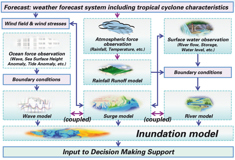 The SWFP provides support to many countries and regions for weather forecasting for the ocean and hydrological model forcing and ocean models that have been implemented through CIFDP. In terms of inland hydrological flooding, there are WMO Interoperable Platforms and Models for Advancing Flood Forecasting and the widely implemented FFGS as input for fast-developing flash floods in upper catchments.