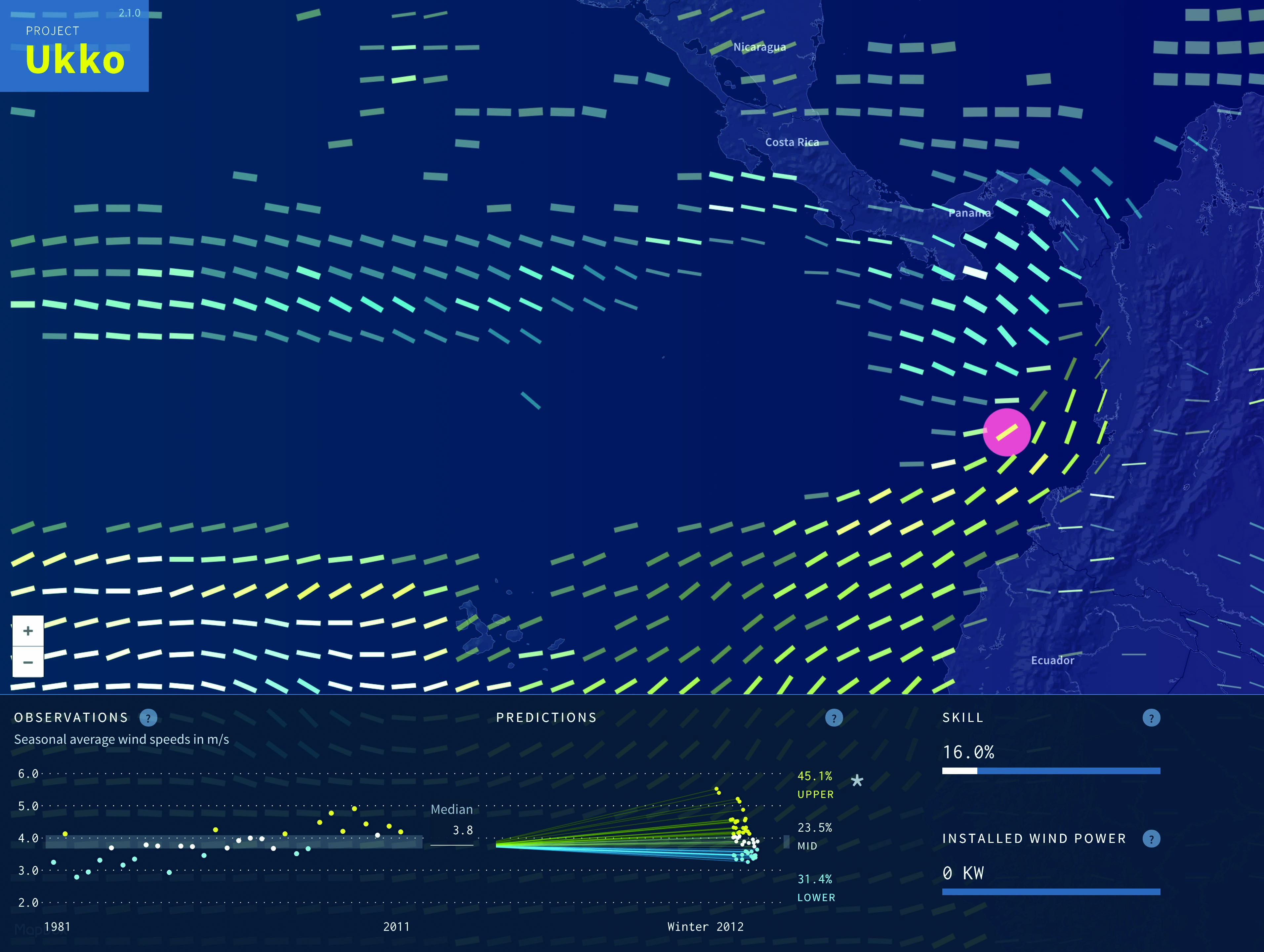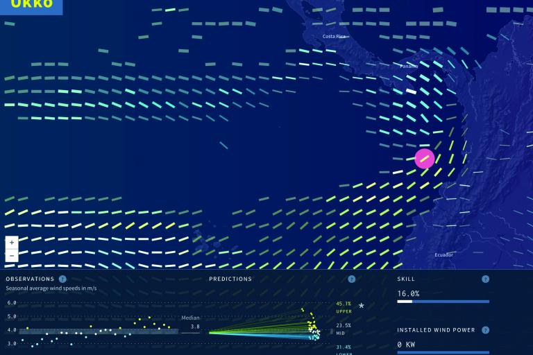 La misma atención se prestó a los aspectos científicos para adaptar el posproceso y la calibración de los datos a las necesidades del sector energético, y también a la representación gráfica de las predicciones probabilísticas para obtener un formato que resultase más legible y atractivo a los usuarios. El prototipo estaba dirigido a dos grupos de usuarios principales: los operadores energéticos que miran más allá del rango meteorológico ampliado de sus operaciones y los operarios de las plantas eólicas que esperan evaluar el rendimiento previsto de la inversión y planificar las operaciones de mantenimiento en plazos que minimicen costes y pérdidas de beneficios. El resultado más visible es el proyecto UKKO, un mapa mundial con capas de datos diseñado para permitir que los usuarios detecten con rapidez patrones y tendencias de las condiciones de viento en el futuro, para a continuación practicar con desgloses de predicciones detalladas a nivel regional. UKKO es un proyecto de Future Everything, el Centro Nacional de Supercomputación de Barcelona y el Servicio Meteorológico del Reino Unido de Gran Bretaña e Irlanda del Norte para EUPORIAS.