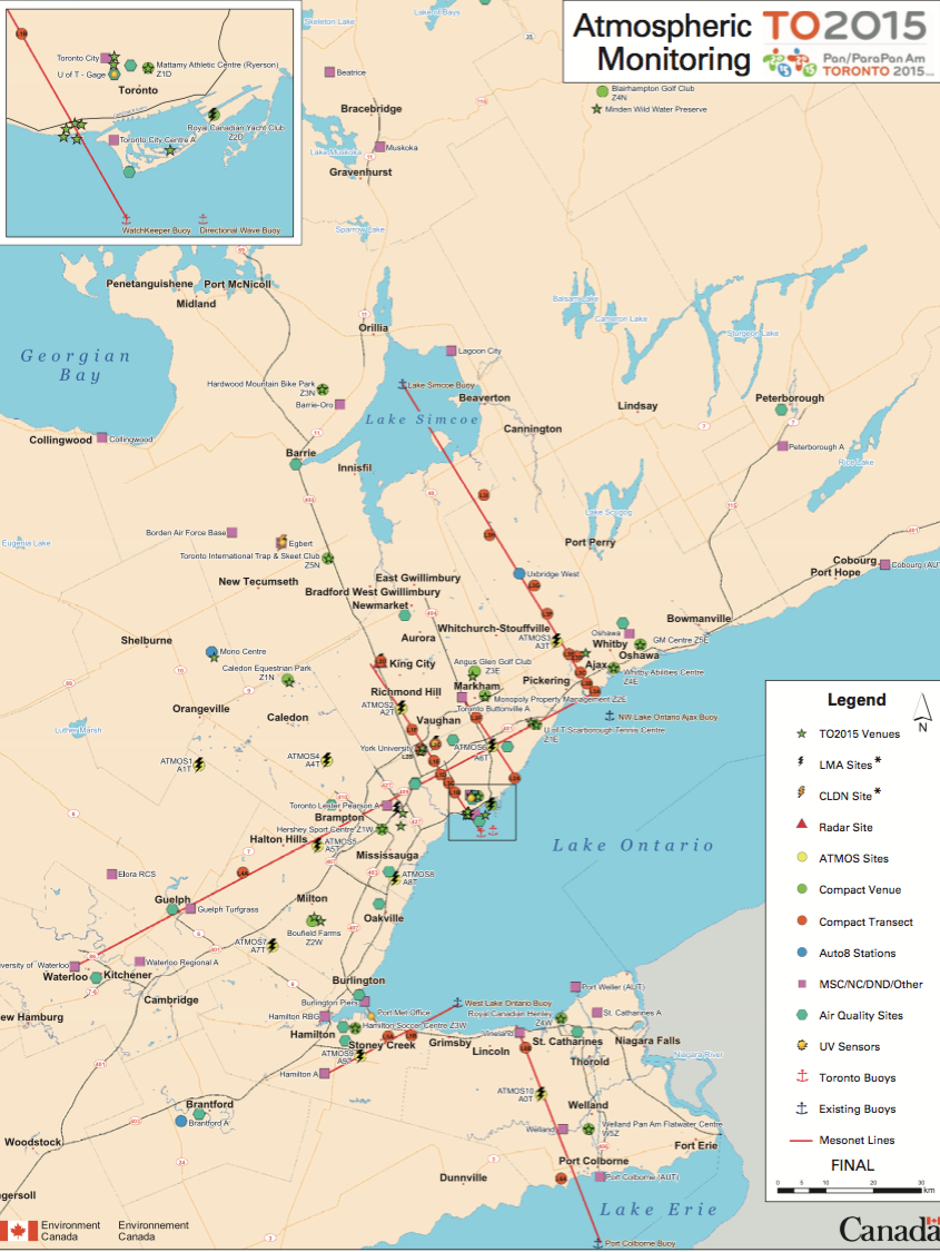Se desplegaron dos nuevas boyas justo al sur de las islas de Toronto en el lago Ontario. Una boya AXIS WatchkeeperTM, dotada de un equipo completo de instrumentos meteorológicos, transmitía información cada diez minutos (lo habitual es cada hora). Una boya direccional de olas TRIAXYSTM, más pequeña, suministraba una medida detallada de las olas direccionales. Cuatro radiómetros ultravioletas (UV) registraban observaciones de radiación solar cada minuto. Una estación meteorológica para la observación de los niveles altos atmosféricos, desplegada temporalmente justo al norte de Toronto, realizó cuatro radiosondeos diarios. El ECCC utilizó por primera vez un vehículo aéreo no tripulado que monitorizó la temperatura, la humedad relativa, la presión, la velocidad del viento y las rachas en los niveles más bajos de la atmósfera. Cuando las condiciones lo permitían, los sensores meteorológicos se sustituían por sondas de calidad del aire para medir el CO2 y las concentraciones totales de aerosoles. El Dispositivo de localización geográfica de descargas eléctricas del sur de Ontario, el primero de esta naturaleza desplegado en Canadá, proporcionó una eficacia del 100% en la detección de descargas con unas resoluciones temporal y espacial muy finas, del orden de decenas de nanosegundos y de decenas de metros, respectivamente.