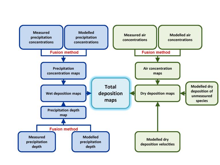 In order to overcome the limitations and maximize the benefit of both approaches, a new method of creating deposition maps, called Measurement-Model Fusion (MMF), has been developed. MMF merges best-available measurements of both wet and dry deposition, including atmospheric concentrations, with best-available CTM estimates of deposition using statistical methods. The technique “nudges” or adjusts model estimates closer to true values by incorporating or “assimilating” measurement values, much in the same way that observations of meteorological variables, such as temperature, wind speed, wind direction and relative humidity, are assimilated into numerical weather prediction (NWP) models in order to improve the accuracy of weather forecasts. Unlike NWP, however, atmospheric deposition measurements cannot be incorporated into deposition models in real or near-real time as deposition-related measurements need to be processed and analysed post-collection. Instead, observations are assimilated at a later stage or retroactively.