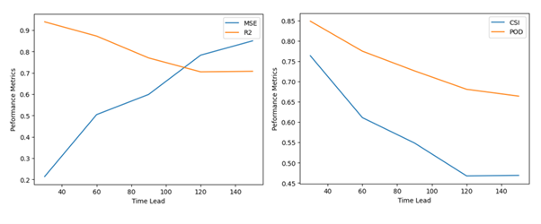 The model is able to reproduce the key spatial features of rainfall events (Figure 1), including location, intensity and movement, across diverse ecological zones in West Africa. While there are occasional distortions in localized cells, the overall precipitation fields match observed patterns well. Performance metrics, such as the probability of detection (POD) and critical success index (CSI) generally decline over successive lead time up to 150 minutes (Figure 2). Similarly, the coefficient of determination (R2) shows dwindling characteristics, coupled with increasing mean squared error (MSE).