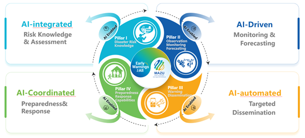 China released the MAZU International Cooperation Initiative (MICI) at the 2025 World Artificial Intelligence Conference (WAIC) as a technology-driven methodology to be shared with global counterparts. MAZU, which stands for Multi-hazard, Alert, Zero-gap and Universal, will support the four pillars identified in the Early Warnings for All Action Plan,