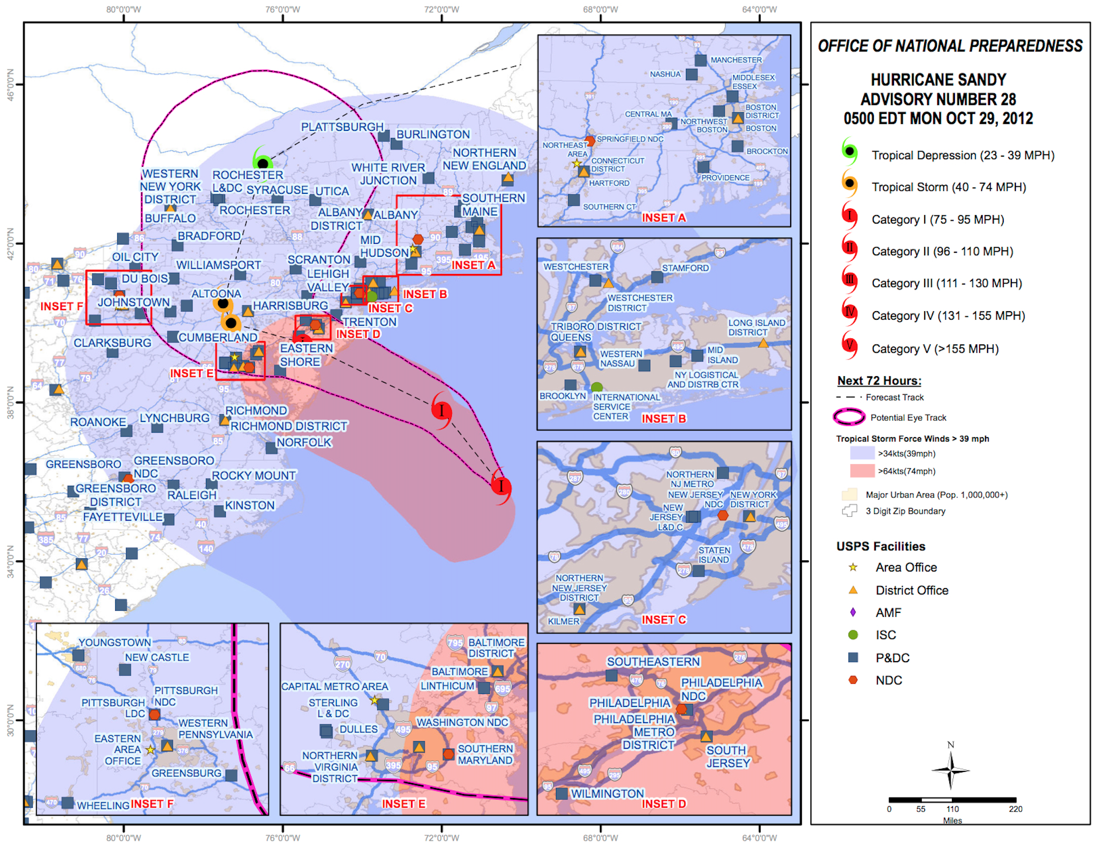 The illustration from a report on Hurricane Sandy, sent to USPS operations managers on 29 October 2012, which maps the meteorological information (the track of the storm) indicating locations of major postal infrastructure (Source: USPS) |