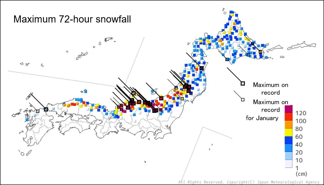Japan experienced a series of heavy snowfall events from mid-December 2020 onward, especially the Sea of Japan side of the country. The snowfall amounts were record-breaking in some places. One of the factors for these events is considered to be the southward meandering of both the polar front and subtropical jet streams around Japan, resulting in continuous cold air flow into the country. The meandering of these polar front and subtropical jet streams was likely to be linked to a blocking high over western Siberia and the ongoing La Ni?a condition, respectively. The summary of investigation was published as a press release from the Tokyo Climate Center and available from its website.