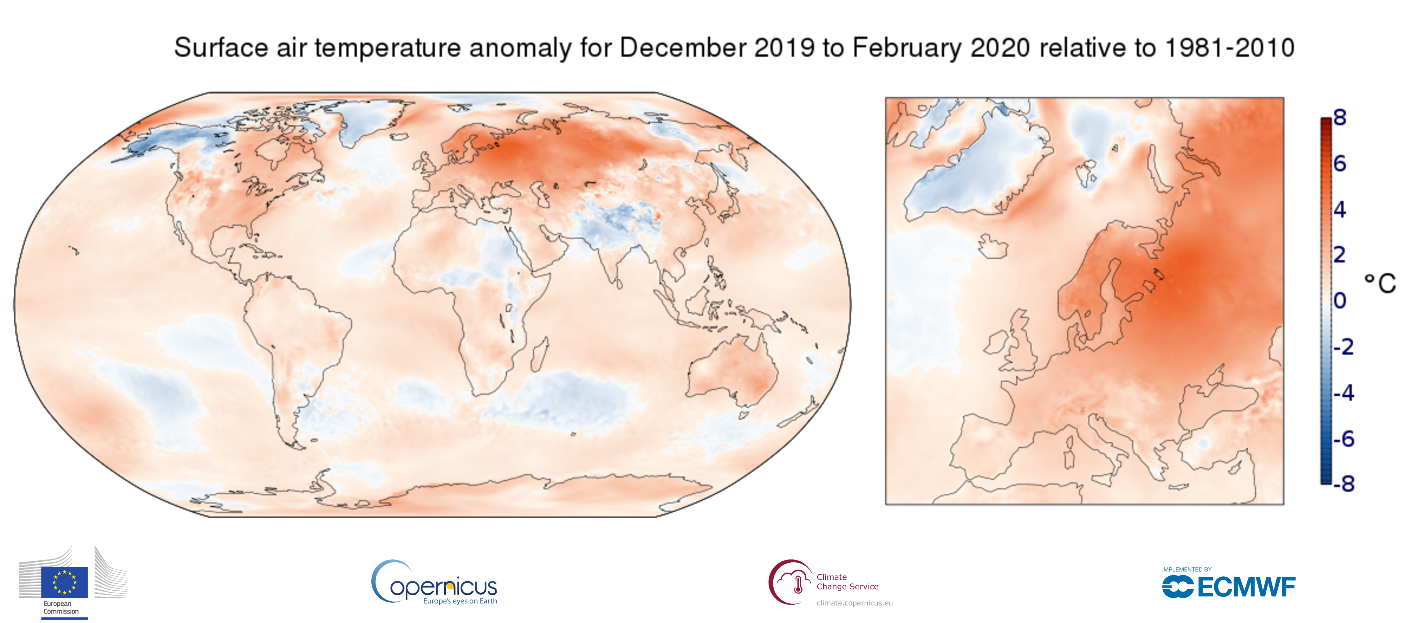 From December 2019 to February 2020, there was persistent mild weather over Europe, particularly in the north and east. The average temperature was almost 1.4°C higher than that of the previous warmest winter, 2015/16 (when there was a strong El Niño) and 3.4ºC above the 1981-2010 norm.