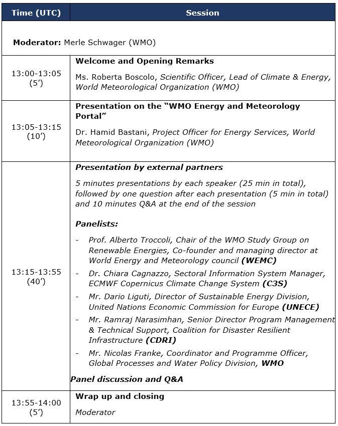 This webinar organized by the WMO Climate and Energy Team aims to launch the WMO Energy and Meteorology Platform, demonstrate its functions, and highlight its importance. Distinguished speakers will contribute to the launch event by presenting the connectivity of their relevant activities.