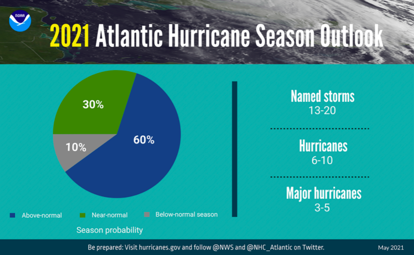 NOAA’s Climate Prediction Center forecast a 60% chance of an above-normal season, a 30% chance of a near-normal season, and a 10% chance of a below-normal season. However, experts do not anticipate the historic level of storm activity seen in 2020.