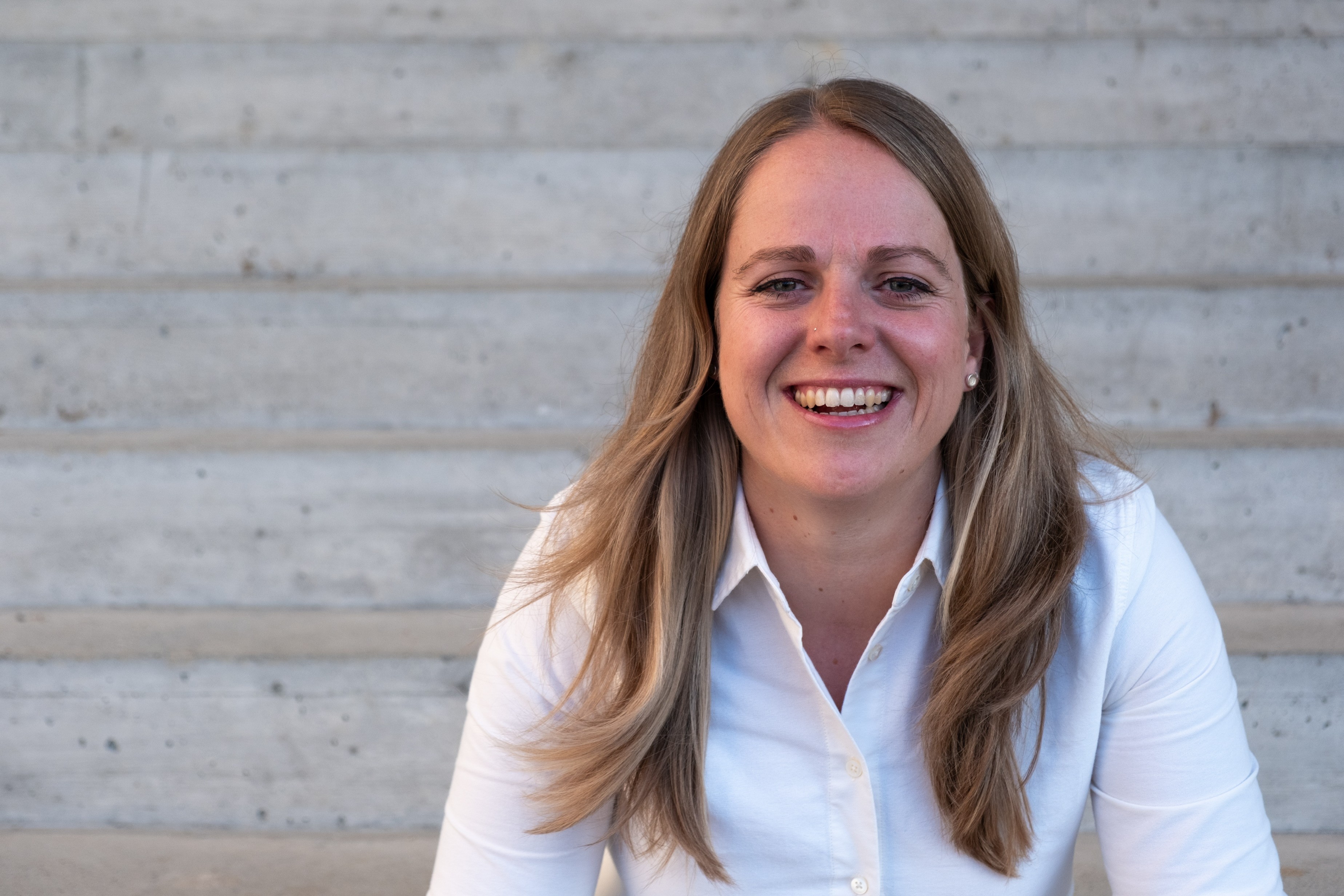 A woman with long blonde hair wearing a white shirt is smiling while sitting in front of a concrete staircase.