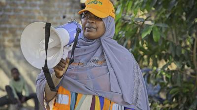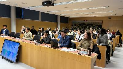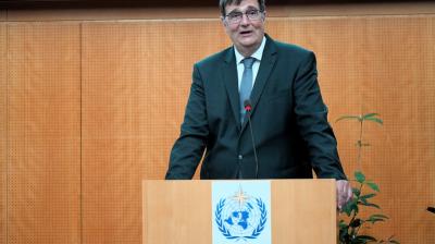 Celeste Saulo in front of the WMO  and Geneva Canton flags