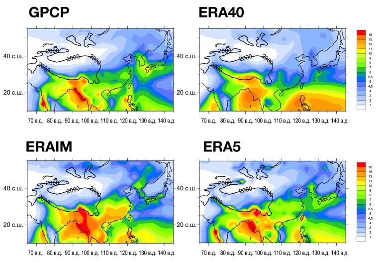 Рисунок 1. Климатические летние (июнь, июль и август) осадки (1979–2002 гг.), полученные на основе продукции ГПКО и на основе различной продукции реанализа (ERA40, ERAIM и ERA5) |