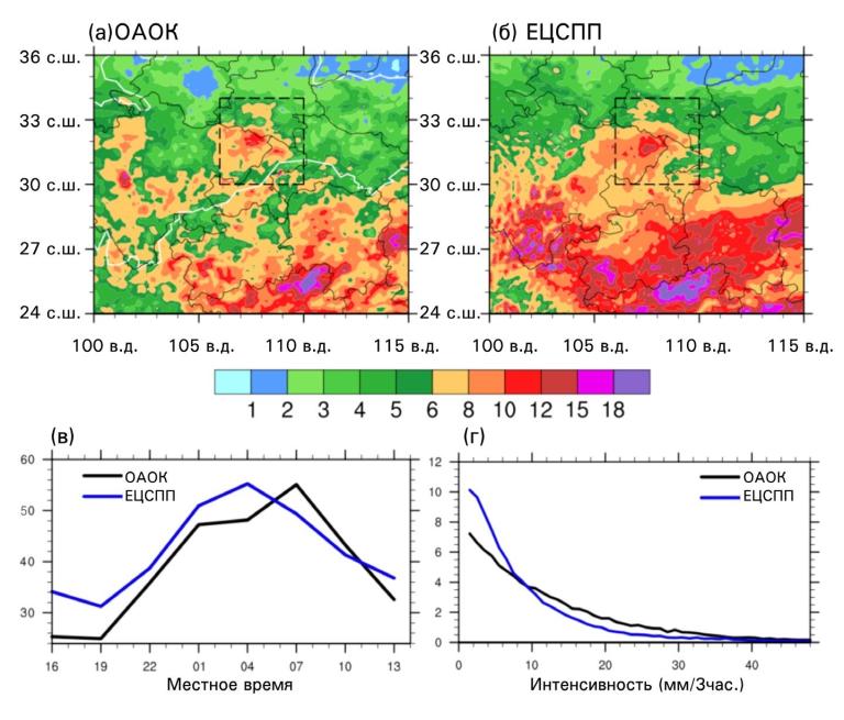 Рисунок 3. Средняя величина среднесуточных осадков (мм/сутки) в западной части Китая за период май-июнь 2019 г. по данным наблюдений (а) и прогнозу на 12–36 ч на основе модели Комплексной прогностической системы ЕЦСПП (б). Целевой район над северной окраиной Сычуаньского бассейна отмечен чёрной пунктирной линией. Региональные осреднённые кривые суточного хода сильных осадков (с интенсивностью в пиковые часы больше 5 мм за 3 часа) по данным наблюдений (чёрная линия) и прогнозу на основе модели (синяя линия) (в). Процентная доля региональных осреднённых суммарных осадков, распределённых на основе разной интенсивности по данным наблюдений (чёрная линия) и прогнозу на основе модели (синяя линия) (г). |