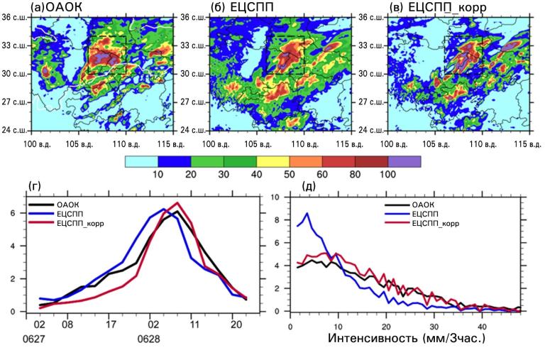 Рисунок 4. Распределение наблюдённых (а), спрогнозированных на основе модели (б) и спрогнозированных на основе модели и скорректированных сильных осадков (в), выпавших в период с 02:00 по местному времени 27 июня 2019 года до 23:00 по местному времени 28 июня 2019 года. Развитие региональных осреднённых осадков во времени в период сильных осадков по данным наблюдений (чёрная линия), прогнозу ЕЦСПП (синяя линия) и прогнозу ЕЦСПП после корректировки (красная линия), (д) то же, что и (г) только для количества выпавших региональных средних осадков разной интенсивности. |