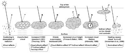 The direct effect refers to scattering and absorption of radiation by aerosols influencing the radiative balance of the Earth-atmosphere system. The indirect effect refers to changing radiative properties, amount and lifetime of clouds by microphysical processes due to the aerosols and hence changing the cloud albedo and the Earth’s radiation budget.