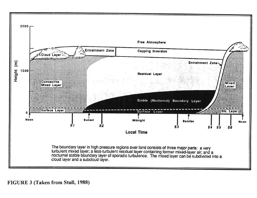 3.1.6 Generally the definition of the height of the ABL is rather arbitrary. For example, the height of the ABL can be identified as the altitude where the mean vertical turbulent fluxes becomes "negligible". Fortunately, the ABL is often capped with a temperature inversion zone; in that case h is equal to zi, the altitude of the bottom of this capping inversion layer. The typical height of the ABL is about 1500 meters. The diurnal variation of the ABL is illustrated in figure 3 ( Stull, 1988).