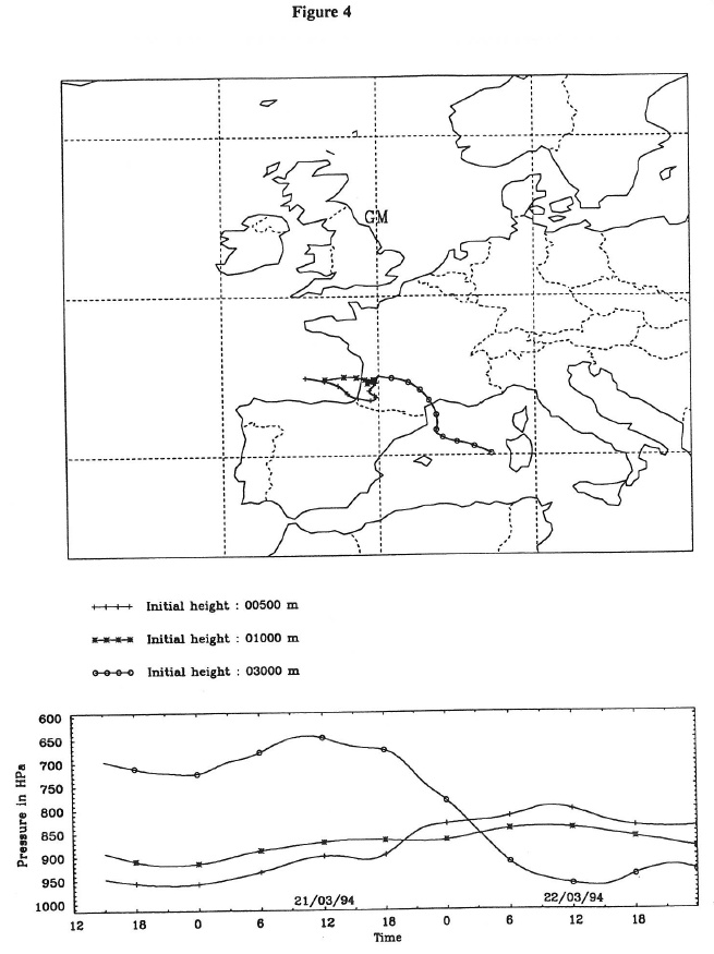 3.3.1 Information on the initial release height and its vertical extent is essential. This is illustrated in figure 4, which shows three trajectories starting at the same time but at different heights. Two of them are in the ABL (500 m and 1000 m), the third one is in the free atmosphere. The results are very different, even for the "in ABL" trajectories. In this extreme case, a release in the lower layer (< 500m) would have moved south then westward along the France-Spain border towards the Atlantic ocean. A release around 1000m would have gone straight West over the Atlantic. In the in the free atmosphere, however, a release would have moved eastward at the beginning, then southward over the Mediterranean sea. Deciding on the proper countermeasures in this particular situation would not have been very easy, if no estimate of the vertical extension of the release would have been available.