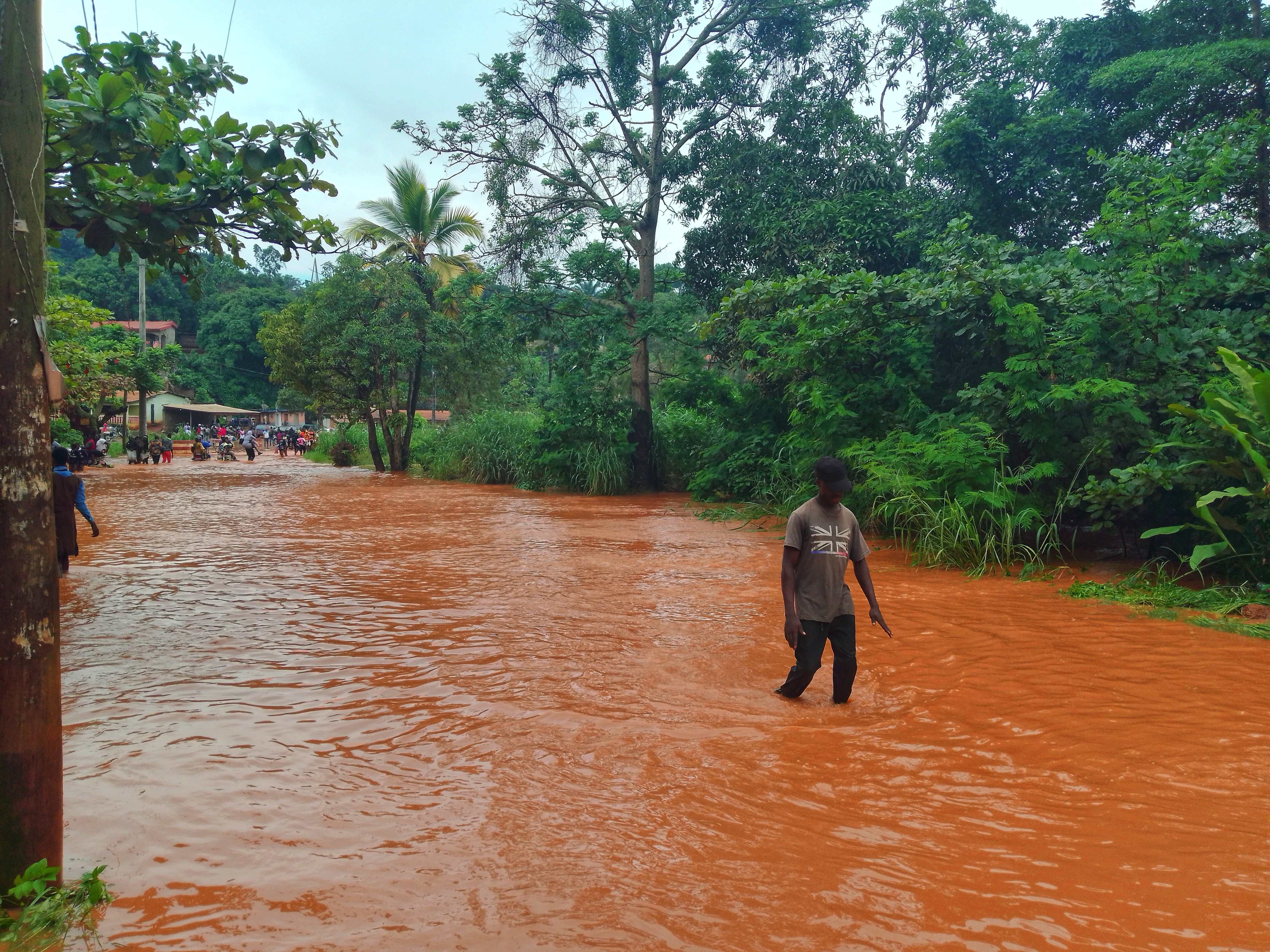 A person walks through a flooded, muddy street surrounded by green trees, with more people and buildings visible in the background.