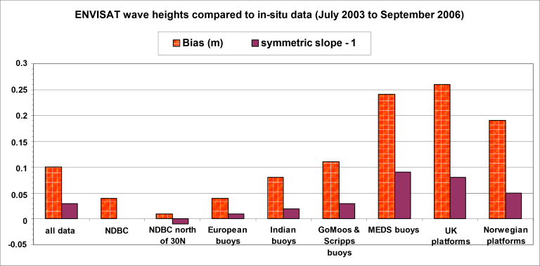 Discrepancies in wave observations. Bias (altimeter – in situ), symmetric slope (ratio of variance altimeter to variance in situ)