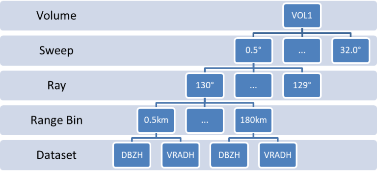 The organization of the data with this information model defines a volume of acquired operational weather radar data as a collection of two-dimensional “sweeps” of data, meaning a collection of radials or rays of data that scan the atmosphere either horizontally or vertically. While the information model recognizes the radial as the basic rational representation of data, the sweep is the representation starting point identified as relevant for international data exchange. Calibration metadata are defined to enable processing of quantitative outputs.