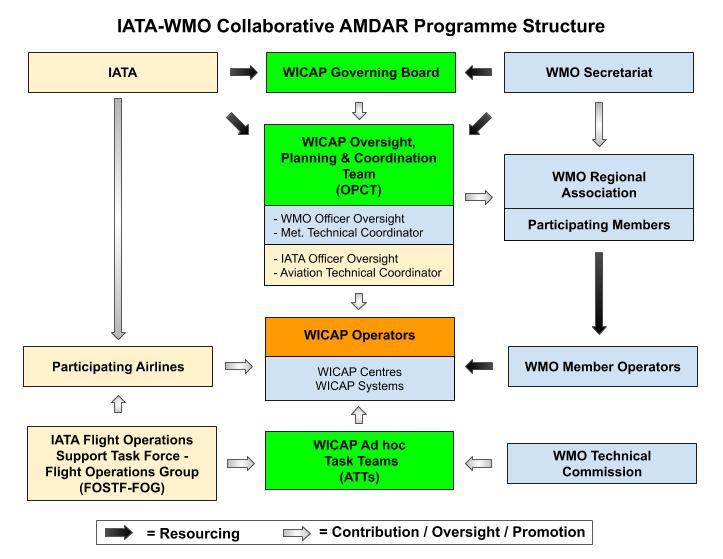 By creating a formal partnership between the airlines (represented by IATA) and WMO (representing its member NMHSs), WICAP will seek to improve AMDAR Programme management and the overall efficiency of the observing system. This includes the formation of a governing board and some additional coordinating and supporting elements that are depicted in green in Figure 3, along with the operational (orange) and organisational elements (WMO in blue and IATA in yellow) that will contribute to the Programme.
