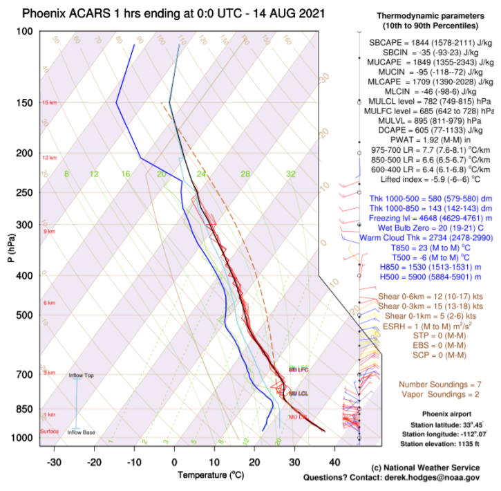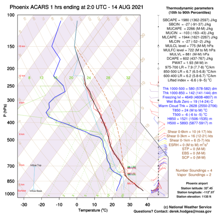 AMDAR Data in WFO Phoenix During Monsoon OperationsMonsoon season in the Desert Southwest region of the United States is notoriously difficult to forecast. During the monsoon, an upper-level high typically sets up near the Four Corners region of Arizona, Utah, Colorado and New Mexico. Deep southerly flow increases moisture transport from the south leading to increased rainfall. The monsoon typically is characterized by conditional instability, weak gradients and indistinct mesoscale features. Minor differences in environmental parameters can make the difference between a non-event and a significant severe weather outbreak. Twice daily radiosondes generally are insufficient to capture crucial mesoscale details. The use of AMDAR soundings has been important at WFO Phoenix for several years as they allow for high temporal resolution of the evolving atmosphere and can give important information to help steer convective forecasts between the standard sounding times. One concern with AMDAR data is that aircraft do not sample the same airspace, meaning they may arrive from differing directions and may not descend uniformly upon approach. As would be expected, this can lead to large variations between soundings, thereby casting doubt on any particular interpretation. To address this issue and better utilize AMDAR data, WFO Phoenix has developed a program to download, QC and post-process these data. The data then can be viewed in bulk and examined in ways that would never be possible with individual soundings. Some of the ways that data are grouped includes composite sounding plots for 1, 2 and 3-hour periods (see Figure 1 which depicts a 1-hour composite plot). Useful derived variables and a hodograph are plotted along the side of the soundings. Data also are grouped to compare how the soundings had evolved over 1, 3, 6, 12 and 24-hour periods. This is particularly useful for comparing how the atmosphere has evolved to assess whether convection is likely on a given day. A Velocity Azimuth Display (VAD)-like wind profile plot has been extraordinarily useful for viewing changes in the wind shear profile. Time series plots showing the evolution of derived variables that are known to be valuable in monsoon forecasting also have been helpful. Some examples include Convective Available Potential Energy (CAPE), low-level mixing ratio, lapse rates or wind shear. The 2021 monsoon season was one of the most active on record for WFO Phoenix with numerous cases where AMDAR soundings improved difficult forecasts. One such example was from August 13-14, 2021. The forecast leading into this event only gave a 30-40% chance of rainfall around the Phoenix area. The atmosphere was characterized by significant instability and wind shear, but whether or not a modest stable layer near 800 hPa would break was in question. 00 UTC 14 August 2021 AMDAR soundings showed a strong stable layer remained (Figure 1). Although some convection had formed in the general vicinity, it was weak and quickly fell apart. By 02 UTC, however, AMDAR soundings showed a significant erosion of the capping inversion (Figure 2). This was caused by a somewhat warmer and deeper mixing layer. We now had confidence that any outflow boundary moving into the area likely would produce convection. Just two hours later, multiple outflow boundaries from severe convection north of the area moved in with widespread convection developing right over the city. Numerous severe thunderstorm and flash flood warnings followed. Being able to view the convective evolution in high temporal resolution was invaluable to assessing the convective trends of the evening and greatly increased our confidence that severe convection would develop.