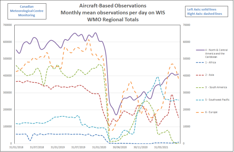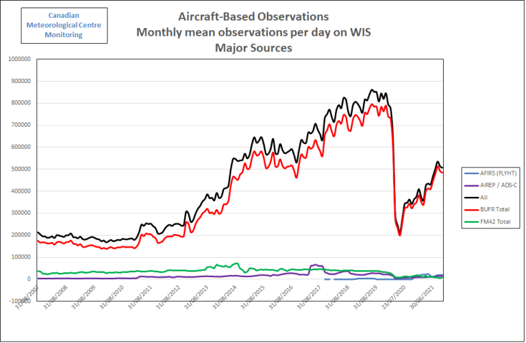 Status of Aircraft-Based ObservationsThe graphic below shows the smoothed monthly average of daily aircraft-based observations (single point measurements in space and time, mainly of air temperature and wind speed and direction, made by an aircraft) transmitted on the World Meteorological Organization (WMO) Global Telecommunications System (GTS) since 2007 up to October 2021, as contributed by: