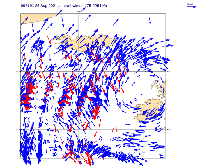 Figure 1 - Reported aircraft winds (175-225 hPa) over part of the North Atlantic for a 12-hour window in August 2021. Red winds are those detected as having the wrong v component by a check in the ECMWF NWP system. |