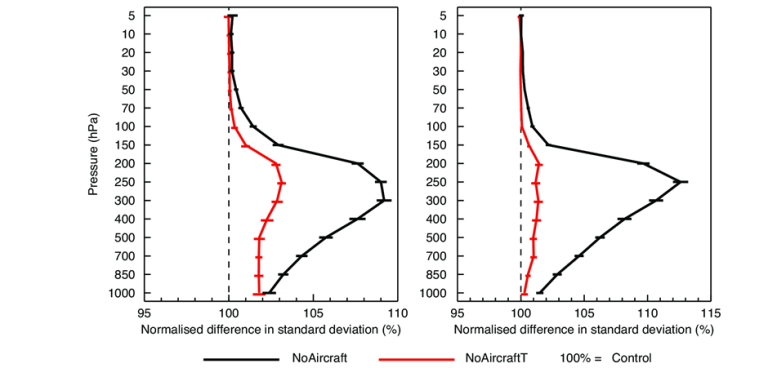 Figure 2 - The impact on 12-hour forecast departure statistics for radiosonde temperature (left) and radiosonde wind (right) for latitudes 20°N-90°N. The black line depicts an experiment with no aircraft data, the red line shows an experiment without aircraft temperature - both normalized by control values. The horizontal bars show 95% confidence intervals. Results of ‘data denial tests’ run at ECMWF for the period 28 January to 30 April 2019 (Ingleby et al, 2021, GRL).References: de Haan, S., J. van der Meulen, and P. de Jong, 2021: Characterizing and Correcting the Warm Bias Observed in AMDAR Temperature Observations. Atmos. Meas. Tech. Ingleby, B., B. Candy, J. Eyre, T. Haiden, C. Hill, L. Isaksen, D. Kleist, F. Smith, P. Steinle, S. Taylor, W. Tennant, and C. Tingwell, 2021: The Impact of COVID-19 on Weather Forecasts: a Balanced View. Geophys. Res. Let. bruce [dot] ingleby |