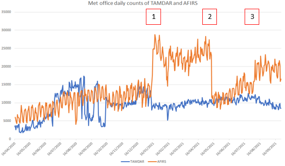 Figure 1 - FLYHT data volumes since April 2020. There has been some variation to the AFIRS data volume which can be explained as follows, Box 1 indicates the addition of Chinese regional data, Box 2 relates to issues with Chinese data provision and Box 3 shows the gradual recovery of the Chinese data which still haven’t reached previous levels. The TAMDAR volumes are stable and currently running at about double the initial levels. |