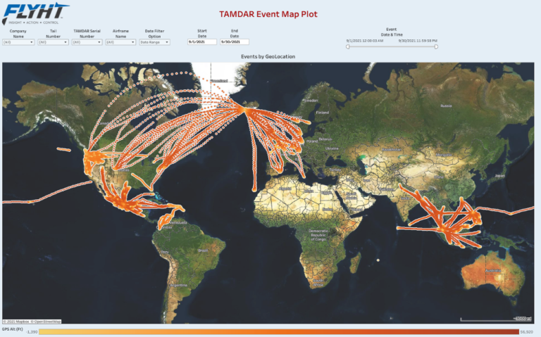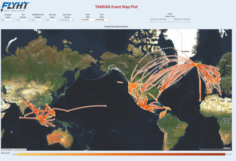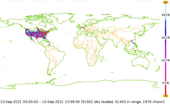 Lufthansa announced recently that all European WVSS-II aircraft will stop operations again in November 2021 and will be grounded until April 2022. No WVSS-II profiles over Europe can be expected during this period. The previously planned return of five of the remaining aircraft in Q4 2021/Q1 2022 will be postponed substantially but is still expected sometime in 2022. The return of the ninth aircraft only is planned for April 2023. The Met Office, UK continues planning a project to install a number of WVSS-II humidity sensors on UK-based aircraft. Delays caused by COVID have led to a reduced number of sensors being considered due to timing of available funds. A single-phase implementation of 30 sensors currently is scheduled to begin in late 2022/early 2023. Discussions with potential airlines are ongoing but as yet no firm commitment to participate has been reached. TAMDARFLYHT saw a steady increase in TAMDAR soundings over the summer months as COVID conditions improved and more people traveled during the summer holidays. However, in the past month we have experienced a slight decrease in soundings most likely due to people returning to work and school and therefore less likely to take a vacation. FLYHT believes the TAMDAR numbers will remain consistent over the next few months with a potential for growth in the sounding counts as the remaining installed TAMDAR fleet returns to service. The map below shows the TAMDAR observations for September 2021. FLYHT continues to see good data coverage over the Northwest U.S., Mexico, Asia as well as transatlantic flights.