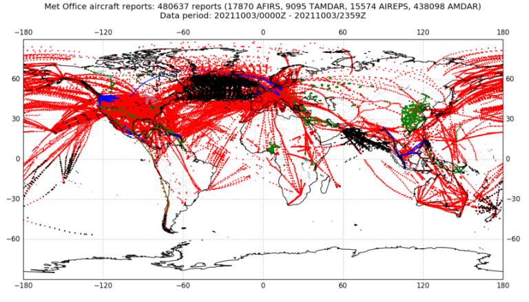 Figure 5: Aircraft based observations (ABO) coverage 3rd September 2021 (courtesy of Met Office, Data Assimilation). AMDAR data red, ADS-C data black, AFIRS data green and TAMDAR data blue.In summary, the data from FLYHT are supplementing the other ABO platforms as well as providing valuable information to regions where upper-air data is are sparse. As of yet, no specific impact studies have been carried out by the MET community. However, several NWP and data centres, along with NMHSs, are assimilating the AFIRS and TAMDAR data. The JET-ABO Expert Team has requested that those organisations assimilating the data provide feedback on data usage and any benefits seen to NWP model products and/or forecasting performance. This information will be used as part of the business case for continued data provision. FLYHT data will continue to be available to users until April of 2022 by way of U.S. NWS funding. Discussions during the first quarter of 2022 will be required to ensure funding of the data continues. stewart [dot] taylor |