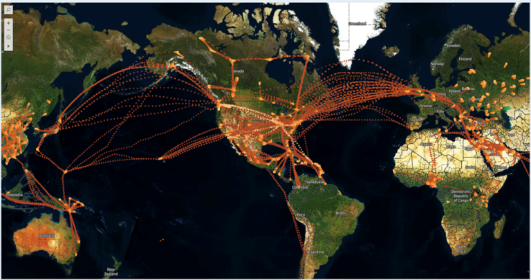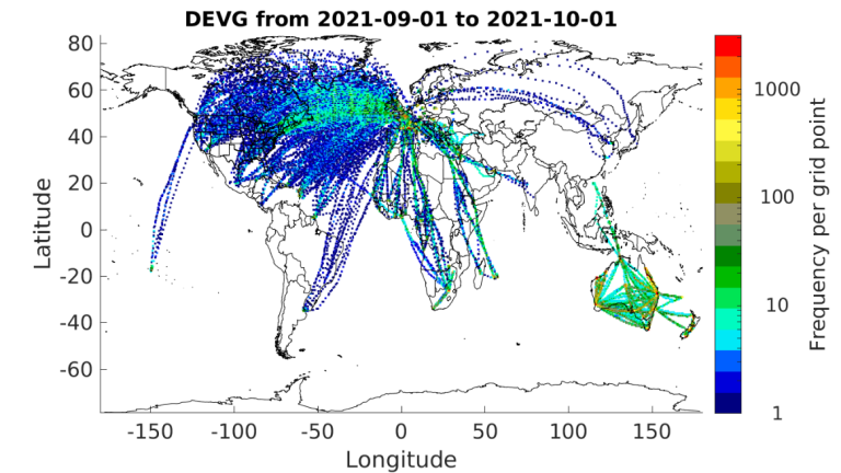 Figure 2: AFIRS global coverage for September 2021. The image clearly shows the regional data coverage over Canada, eastern Europe, Asia and Africa (courtesy of FLYHT). |