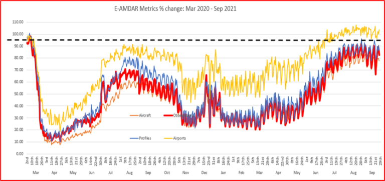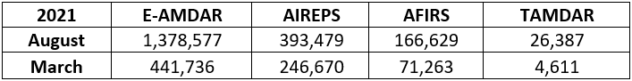 In terms of overall numbers, all types of Aircraft-based Observations collected for users within the European area have shown consistent increases over the last 5-6 months and totals now are exceeding the levels of pre-COVID observations. |