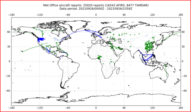 Figure 4 - Global coverage of AFIRS (green) and TAMDAR (blue) 19th September 2021. |