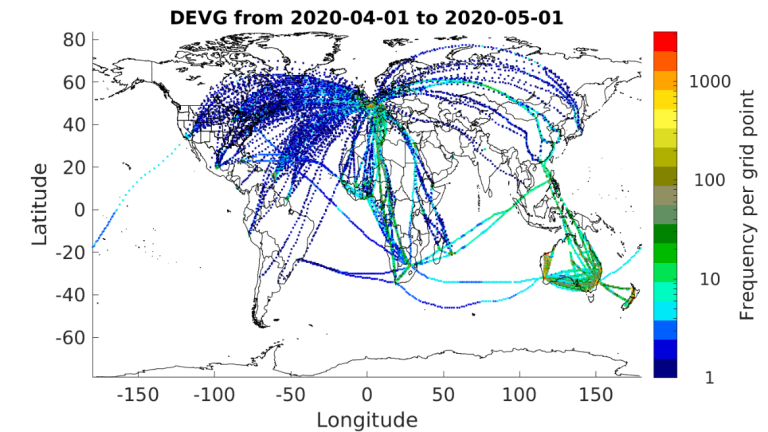 The second metric, derived equivalent vertical gust (DEVG), is defined as the instantaneous vertical gust velocity which, superimposed on a steady horizontal wind, would produce the measured acceleration of the aircraft. The effect of a gust on an aircraft depends on its mass and other characteristics, but these factors are accounted for so that a gust velocity can be calculated which is independent of the aircraft. Before the impacts of COVID-19 were truly felt by the aviation industry, more than 360 aircraft were reporting DEVG worldwide averaging about 20,000 reports daily. Starting in early March of 2020, DEVG reporting also dropped significantly, down to about 15% of pre-COVID-19 levels. These numbers are based on an analysis of AMDAR data from The U.S. National Centers for Environmental Prediction’s (NCEP) Meteorological Assimilation Data Ingest System (MADIS). A large fraction of the DEVG data appears under a few tail numbers, which is unrealistic, and thus the estimated number of aircraft reporting DEVG is substantially underestimated. Currently, there are at least 150 aircraft reporting about 16,000 measurements per day (about 80% of pre-COVID-19 levels). Figures 5, 6 and 7 show the locations of all DEVG reports for September 2019, April 2020 and September 2021, respectively. There is software-based logic implemented on many aircraft that limit reporting of DEVG in some regions at certain altitudes (e.g., Europe). DEVG reporting has increased over North America but continues to have limited coverage in the southern hemisphere.
