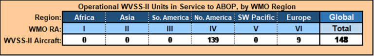 ABOP Water Vapor MeasurementGlobal Water Vapor Measurement Summary and UpdateAircraft Based Observation (ABO) water vapour data are used especially as input for numerical weather predictions and other forecast operations. Two sensor systems currently are employed for ABO water vapour measurement on commercial aircraft worldwide: the second-generation Water Vapor Sensing System (WVSS-II) and Tropospheric Airborne Meteorological Data Reporting (TAMDAR). FLYHT Aerospace Solutions Ltd. announced the recent acquisition of the WVSS-II system. FLYHT looks forward to working with the weather community and airlines to expand the WVSS-II sensor network. FLYHT believes the global meteorological community, aviation industry and general public all will benefit from the continued production of this sensor and its high-quality data set. Additional information is available at the FLYHT website. WVSS-IIMeasurements with the WVSS-II sensor currently are conducted onboard 148 commercial aircraft worldwide. 139 of these belong to RA-IV (North America) and nine to RA-VI (Europe). The number of WVSS-II-equipped aircraft has remained unchanged since 2017. The table below shows the breakdown of WVSS-II reporting aircraft across all WMO Regions.