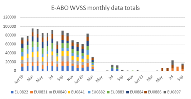 Compared to 2020, WVSS-II-equipped aircraft produced significantly more observations beginning in September of this year but they still lag far behind 2019 levels which can be seen in the figures below, courtesy of EUMETNET ABO. The figures show the RA-VI coverage of WVSS-II data over a one-week period (30th September - 6th October) for 2019 (left) and 2020 (middle) and 27th September – 3rd October for 2021.