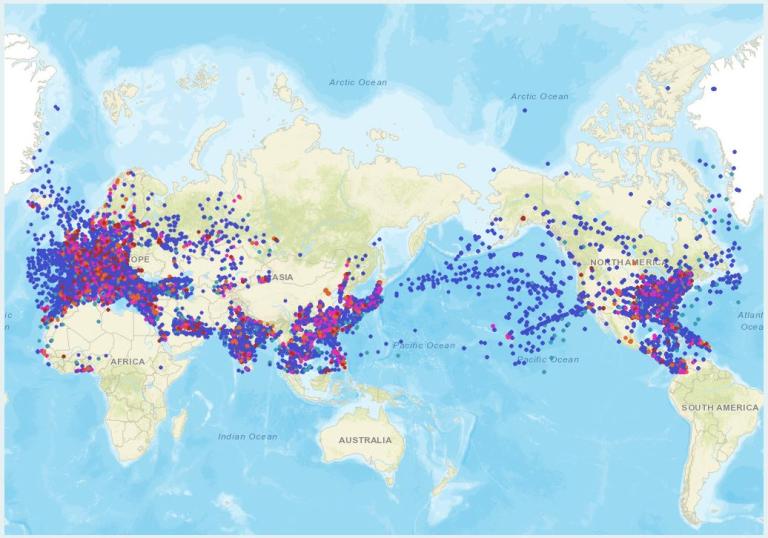 ABO Data Volumes and CoverageThe graph shows that recently towards the end of 2019 and start of 2020, aircraft-based observations data volumes had increased to a historical maximum of more than 850k observations per day on the GTS, with AMDAR observations making up the majority of these at around 750k observations per day. From March 2020, as a direct result of the impact of COVID-19 on the aviation industry and airlines, the volume of aircraft-based observations overall fell to around 245k observations per day and to 230k for AMDAR - around 30% of December data volumes for both. The biggest monthly reduction occurred in May 2020, with only an average of 210k observations per day available. Since then, data levels have gradually increased overall with mean daily total observations at around 670k observations per day in April 2023, which is around 80% of the December 2020 data volume. The graphic above, courtesy of NOAA, provides an indicative coverage of the full ABO observing system over a 4-hour period on 22 May 2023, with around 12% of available observations shown on the map. The colour provides an indication of the altitude of the observation, ranging from red at low altitudes when aircraft are taking off or landing, to light blue, indicating altitudes at cruise levels. |