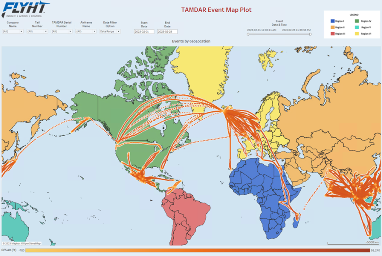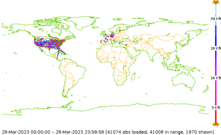 In February 2023, these aircraft generated on average 581 TAMDAR soundings per day with the highest concentration of profiles found over the Southwest Pacific and Asia followed by North America. Sixty-six of the 129 active aircraft reported TAMDAR observations in February. The map below shows the TAMDAR observations for February 2023.