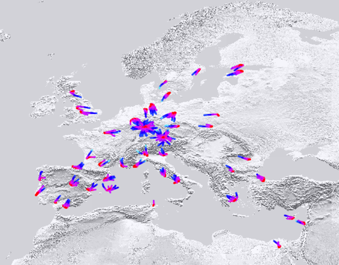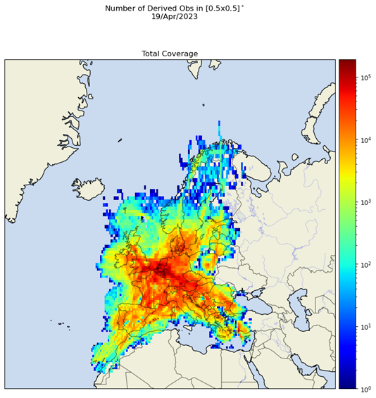 Regional Coverage of Water Vapour Measurement Under the USA ABO programme, RA IV continues to have 131 aircraft from Southwest Airlines and the United Parcel Service equipped with WVSS-II sensors. Typical daily water vapor profile numbers remain at approximately 1000. All nine WVSS-II-equipped aircraft (all A321 airframes) in RA-VI are back in service. E-ABO and airline partner Lufthansa Group share operations within the E-ABO network. The following figure shows the RA-VI coverage of WVSS-II data over a one-week period (March 23–29, 2023).