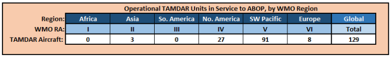 TAMDAR FLYHT currently collects data from 129 active TAMDAR-equipped commercial aircraft. The breakdown of active TAMDAR aircraft by WMO region is shown below.