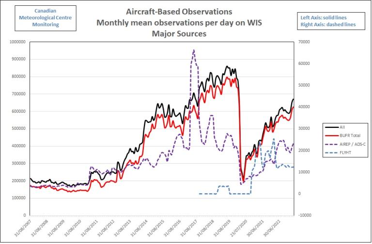 Status of Aircraft Based ObservationsThe graphic below shows the smoothed monthly average of daily aircraft-based observations (single point measurements in space and time, mainly of air temperature and wind speed and direction, made by an aircraft) transmitted on the World Meteorological Organization (WMO) Global Telecommunications System (GTS) since 2007 up to October 2022, as contributed by: