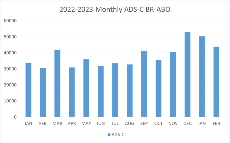 Figure 1. Brazilian ABO program data during 2022 and first two months of 2023. Blue bars represent ADS-C data. Source: Quilson Aragao Santos (DECEA - Brazil). |