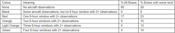 WMO Region V, Southwest Pacific, ABO UpdateThe first (virtual) meeting of the RA-V Expert Team on WICAP (ET – WICAP) was held on 5th April 2023, with representatives from Fiji, New Zealand, Samoa, Papua New Guinea, Australia, Malaysia and the WMO RA-V Secretariat participating. One of ET-WICAP’s first objectives is to understand the current status of aircraft-based observations within the Region. To assist, data from a typical day (in this case, 18th September 2022) were compared with the WMO's Rolling Review of Requirements for Global Numerical Weather Prediction: In the figure below, RA-V has been divided into 200km x 200km boxes (due to the map projection, the boxes appear larger in the south, but all are the same size.