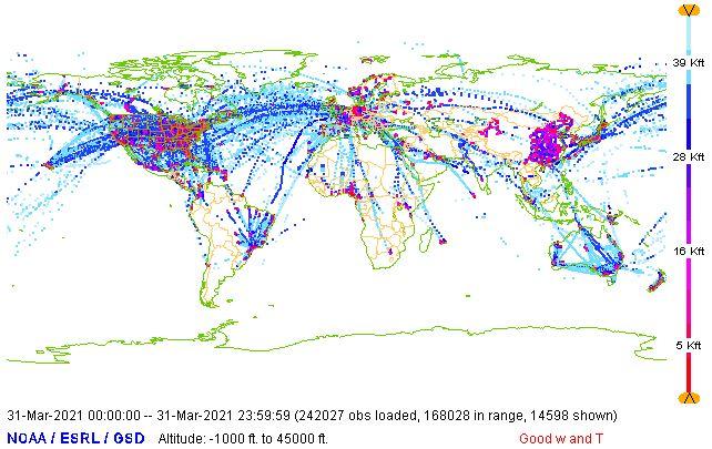 The graphic below shows the smoothed, monthly average of daily aircraft-based observations (single point measurements in space and time, mainly of air temperature and wind speed and direction, made by an aircraft) transmitted on the World Meteorological Organization (WMO) Global Telecommunications System (GTS) since 2007 up to March 2021, as contributed by: