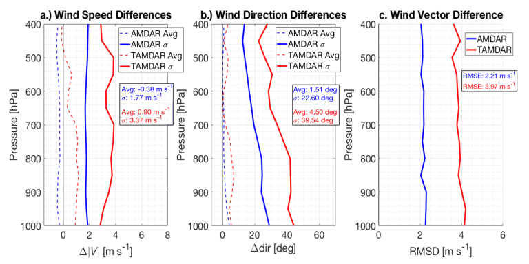 a. Winds:  AmR differences for the two ABO systems were calculated for wind speed (a) and direction (b) individually and combined as the vector difference (c).  For all parameters, AMDAR wind observations outperform TAMDAR reports collected from smaller aircraft by nearly a factor of two (see inserts in Fig. 1).  Systematic speed differences (averages) are of opposite signs (-0.4 m s-1 for AMDAR vs. +0.75 m s-1 for TAMDAR) while directions show differences of +1.5° and +4.9° respectively.  Random differences (σ) are larger for both systems, but with AMDAR being nearly twice as consistent as TAMDAR [±1.77 m s-1 (±23.0°) and ±3.46 m s-1 (±39.7°) respectively].  Root Mean Squared (RMS) Vector Differences (RMSD), which combines both speed and directions differences, indicate TAMDAR disparities nearly double those from AMDAR (3.97 m s-1 vs. 2.21 m s-1).
