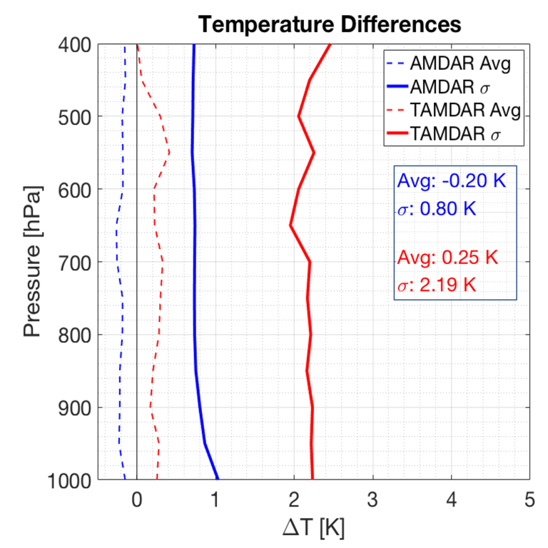 Vertical profiles (Fig. 2) show fairly uniform average AmR temperature differences.   Random differences decrease from ~±1.0°K in the lowest levels to ±0.7°K above about 850 hPa which are consistent with small-scale variabilities expected between radiosonde sites and nearby airports.  By contrast, average TAMDAR differences increase from 0.3°K near the surface to 0.4°K at 500 hPa, with standard deviations increasing irregularly from ±2.1°K near the surface to ±2.7°K aloft, more than double the AMDAR uncertainty.  (More details in Section 3b of W&P.)