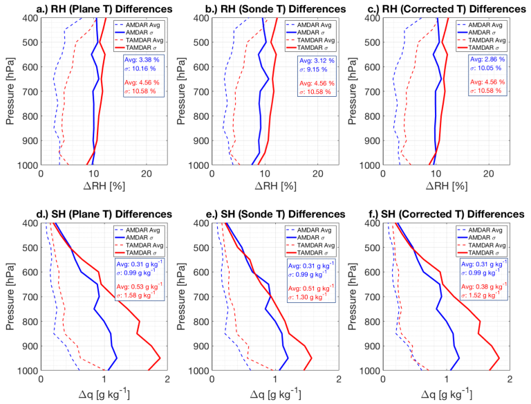 Figure 3:  a.) Vertical profiles of the AmR average difference (solid lines) and standard deviation (dashed lines) for AMDAR (blue) and TAMDAR (red) RH observations in percent in pressure coordinates.  AMDAR/WVSS SH reports are converted to RH using the aircraft temperatures.  b.) As in a., but with AMDAR/WVSS data converted to RH using the collocated radiosonde temperatures.  c.) As in a., but using bias-corrected AMDAR temperatures.  d.) As in a., but for SH.  TAMDAR RH reports converted to SH using the aircraft temperatures.  e.) As in d., but for TAMDAR RH converted to SH using the collocated radiosonde temperature.  f.) As in d., but using bias-corrected TAMDAR temperatures.